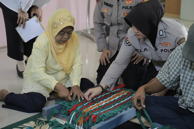 Tidak hanya itu, Aiptu Tri dan Bripka Ela juga melihat langsung para ODGJ membuat kerajinan keset berbahan kain perca. Menurut Aiptu Tri, pelatihan keterampilan ini perlu ditunjang sejumlah peralatan.